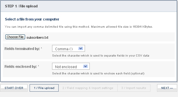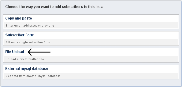 This screen will help you choose the method you wish to use for adding new subscribers - in this section we will use the first method "File upload".