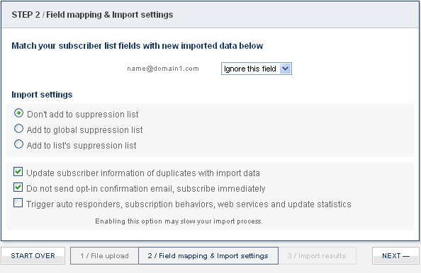 Here you will need to map the fields within your system with the import data fields. If you have custom fields within your mailing list they will be displayed in the drop down.