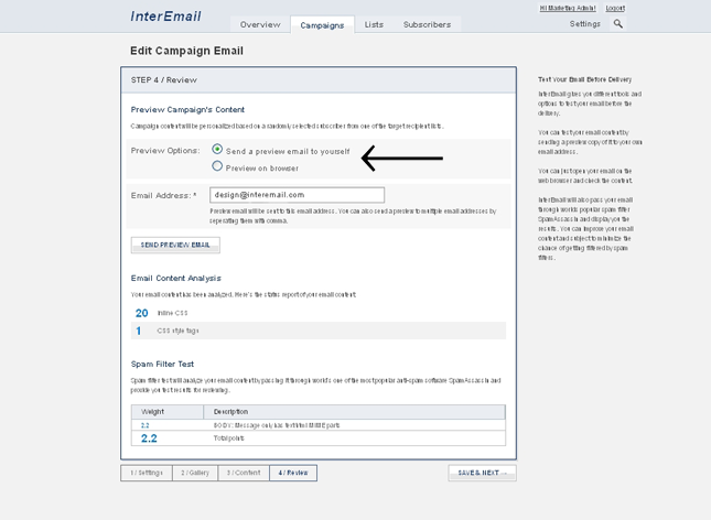 The system provides you two different methods to preview your email on the last step of the campaign email creation process.