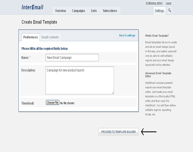 Once you go to the Create New Template menu the system will allow you to configure preferences of your email template such as the name, description and a thumbnail picture on the first tab.