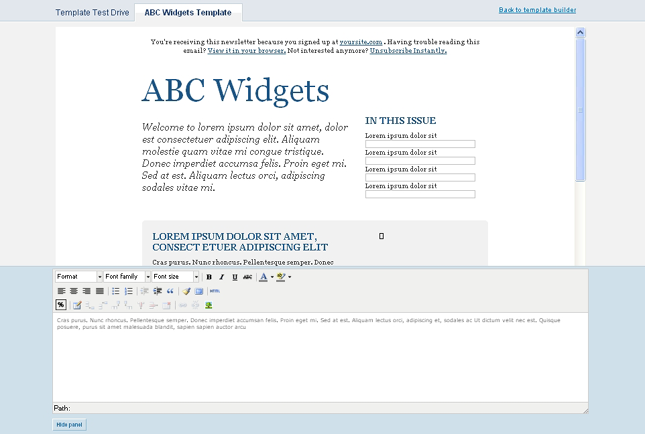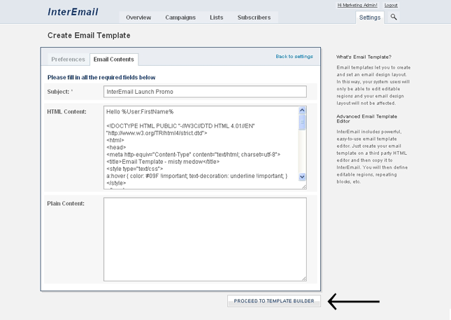 As in the above screenshot you will see that the html code provided on the previous screen under the Email Contents tab has been rendered into a properly formatted html layout. This example is a generic layout and the template builder interface can be used to customize it and define the various editable regions and other types of regions in the template as required.