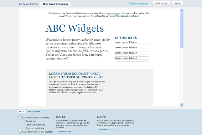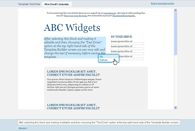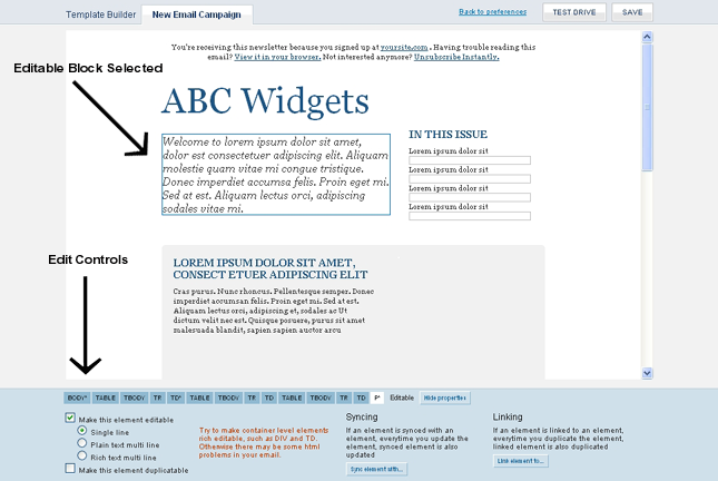 For this example will make the selected element editable as well duplicatable. Once you have made the necessary changes click on the "Test Drive" button at the top of the template builder screen in order to see how your template will look and function.