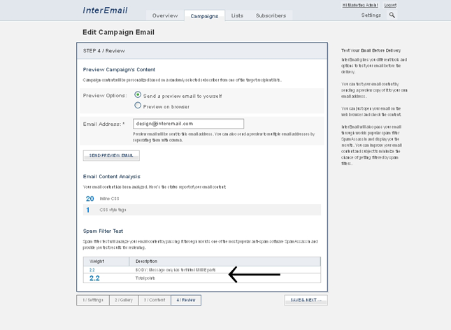 The system provides an easy to use built in email content analysis tool. This tool is available when you are finished creating your campaign email and are on the last step of previewing and saving the campaign.