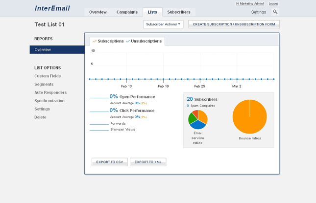 The below screen shot gives you the overview of your mailing list with the details such as Subscription / Un Subscription trends in a graphical chart format, open performance, click performance, email service ratio, bounce ratio etc. for the particular mailing list.
