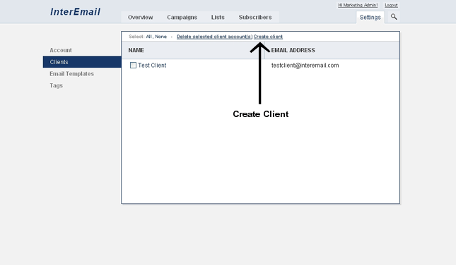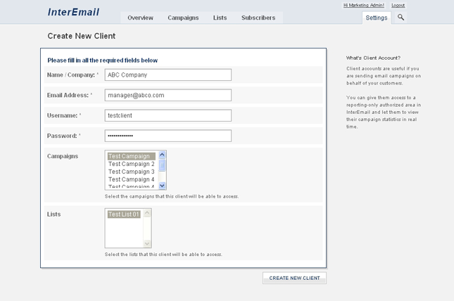 Complete the required fields and assign the campaigns and mailing lists the client will be allowed access to.