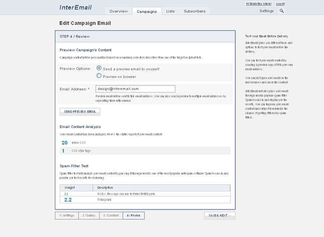 The review screen will also give you the details of the content analysis and basic Spam testing.