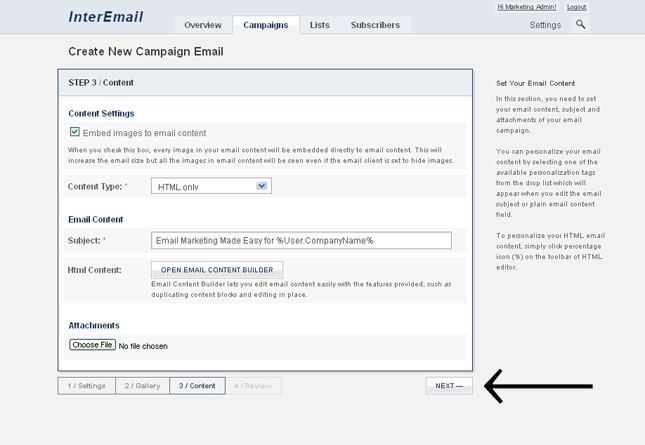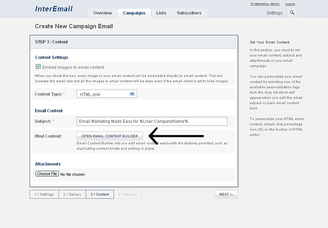 Campaign Email Creation Step 3 / Content