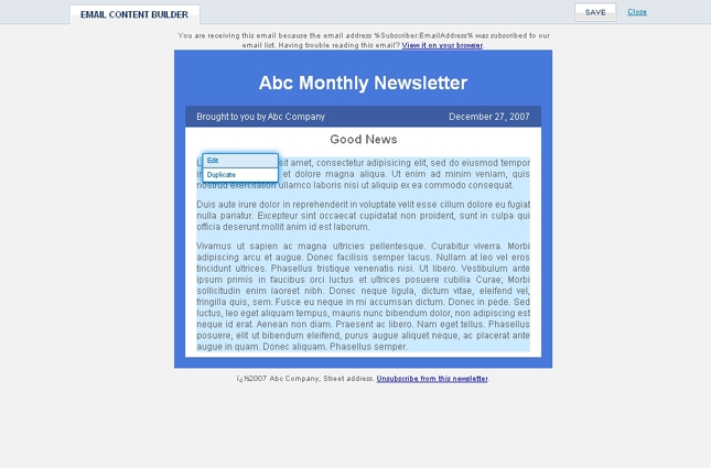 The email content builder will help you add your own content within the available editable regions. The system has an advanced template engine which allows you to easily edit your content within the pre-defined campaign template. In order to edit the content you just have to place your mouse on the content box and click your left mouse key once - if the area is editable it will give you the "Edit" menu as shown in the screenshot below.